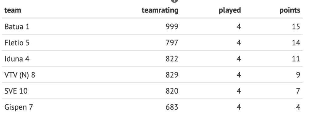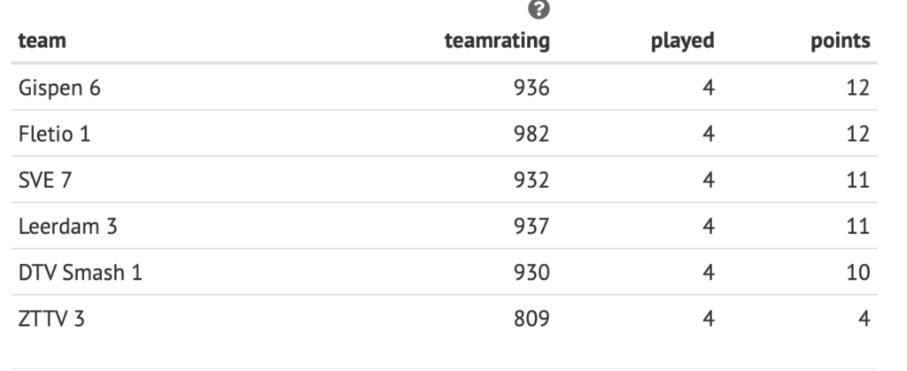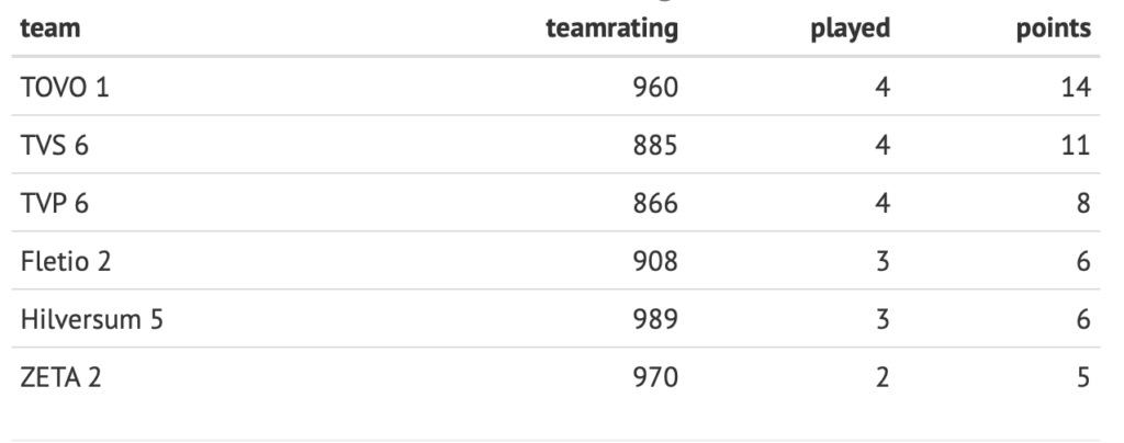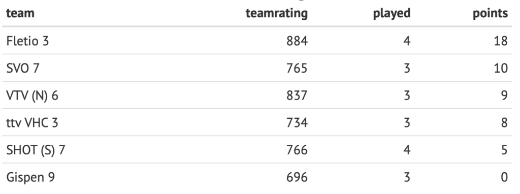 Fletio 6 (Niels, Rodrigo en Fred) staat op dit moment laatste in hun poule in de zesde klasse – maar gezien de rankings en het verschil van maar twee punten, moet het gat naar de middenmoot te dichten zijn. Niels doet het netjes, met drie van de zes partijen gewonnen.